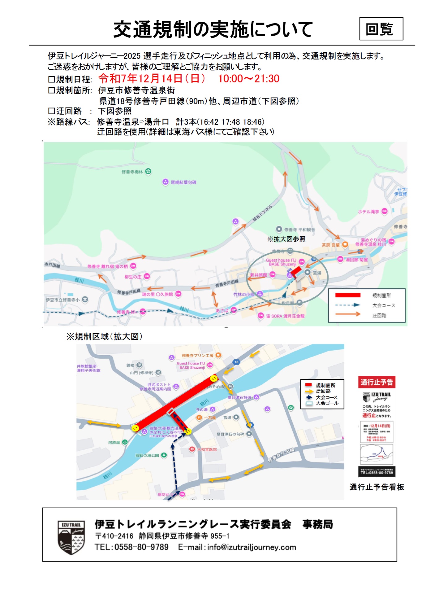 伊豆トレイルジャーニー2025 が開催されるにあたり、 修禅寺の前あたりが交通規制区域となります。